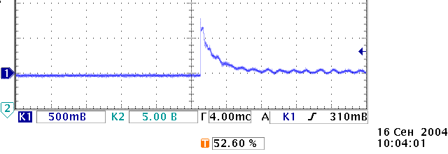 Второе требование к источнику питание- он должен выдерживать импульсные нагрузки. Внутренние питания в блоках формируются преобразователями питания (DC-DC converters), которые в процессе запуска потребляют значительный ток. Ниже приводится осциллограмма пускового тока для блока CDAC20. Осциллограмма снималась с резистора 0,1 Ом, включенном в цепи питания. Соответственно, одно деление осциллографа по вертикали соответствует 5 А. Из осциллограммы видно, что устройство несколько миллисекунд потребляет значительный ток (в пике около 8 А), хотя номинальный ток потребления для этого блока составляет 0.67 А. Следует учитывать, что иногда к одному источнику питания подключается несколько блоков.