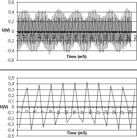 Левая пара картинок представляет запись сигнала частотой 50 Гц, а правая