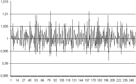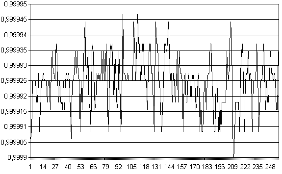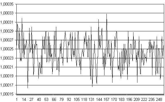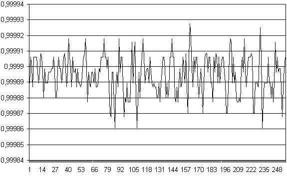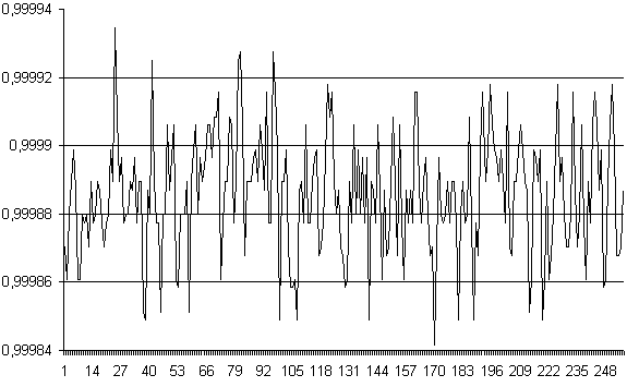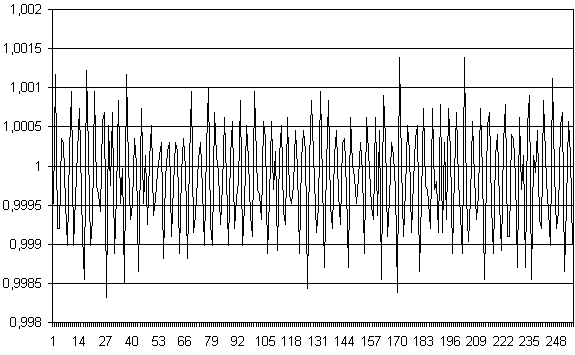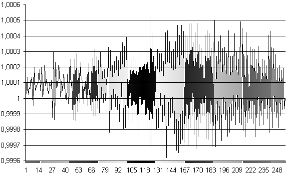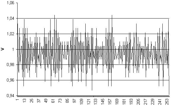 Одной из существенных составляющих погрешностей измерений (по крайней мере при малом времени интегрирования) является шум преобразователя. Ниже приводятся картинки, иллюстрирующие шумы устройства. Измерения производились блоком CANADC40 сигнала 1 В при входной шкале 10 В и при 8-ми временах интегрирования.