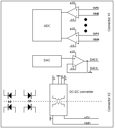 Существенным отличием блока CDAC20 от устройств CANDAC16, CANADC40 является наличие гальванической развязки между цифровой части и аналоговой. Это существенно облегчает борьбу с помехами и наводками. Правда это приводит к появлению в устройстве еще одной "земли" и несколько отличному соединению устройства с объектом управления и контроля.