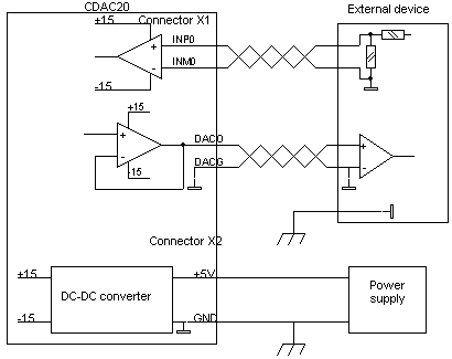 Входное напряжение от источника сигнала к аналого-цифровому преобразователю рекомендуется приводить с помощью витой пары, один конец которой (от входа INPx) соединяется с измеряемой точкой, а второй конец (от входа INMx) соединяется с той точкой, которая будет считаться "земляной" для измеряемого сигнала (чистой "землей"). Соединение выхода цифроаналогового преобразователя с потребителем также рекомендуется выполнять с помощью витой пары. Вывод DACG блока и является выводом "чистой" (аналоговой) "земли", который и должен быть соединен с аналоговой "землей" объекта управления и контроля. При этом соединение аналоговой "земли" с "землей" установки потребитель выполняет таким образом, каким ему это удобно. Соединение с "землей" установки цифровой части блока CDAC20 должно производиться на отрицательном проводе от источника питания (либо от разъема источника питания, либо от разъема X2 блока CDAC20).