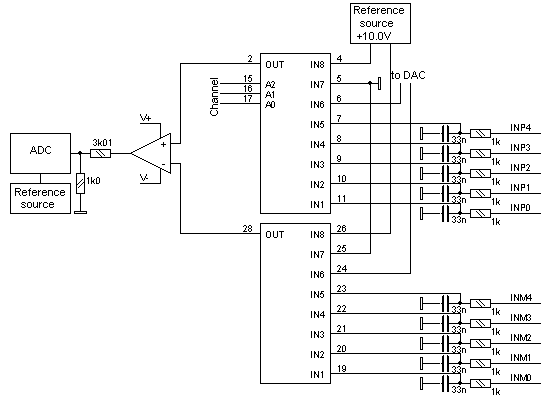 Остальные пять пар входов АЦП доступны для внешней коммутации и выведены на соединительный разъем. Следует отметить, что все входные линии АЦП соединены с входным коммутатором через интегрирующие цепочки с постоянной времени около 47 мкс. Это не вносит дополнительных погрешностей ни при каких штатных измерениях, но может сказаться в двух случаях. Если источник сигнала имеет высокое выходное сопротивление, то суммарная постоянная времени может быть велика и влиять на точность измерения сигналов переменного напряжения. Кроме того, иногда подключение такой емкости к источнику сигнала, может не "понравиться" самому источнику сигнала. Второй случай- это попытка измерять прибором напряжения за пределами гарантированный параметров. Сопротивление этого резистора вместе с внутренним сопротивлением мультиплексора составляет величину около 3 Ком. Входной ток инструментального усилителя может достигать 2 нА. Ошибка из-за разности токов и сопротивлений может достичь 5-10 мкВ. Это далеко за пределами гарантированных точностей, но пользователь иногда пытается производить измерения и в этой области.