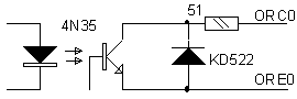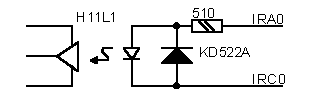 Как следует из схемы, входной регистр срабатывает при подаче на вывод IRA0 положительного напряжения относительно вывода IRC0. При подаче обратного напряжения, входной ток замыкается защитным диодом. Драйвер оптического приемника имеет в своем составе триггер Шмитта, что позволяет не заботиться о фронтах принимаемого сигнала.