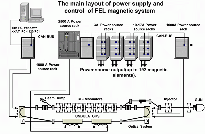 В 2003 году была запущена система питания ускорителя в KAERI (Korea), включающая в себя 96 3-15 амперных управляемых источника и два 300 амперных источника. На фотографии показаны три радиостойки- две 48-канальные стойки маломощных источников питания (от 3-х до 15 А) и дальняя стойка содержит два мощных 300-амперных источника питания. Все радиостойки соединяются с управляющей ЭВМ посредством единственного связного кабеля.
