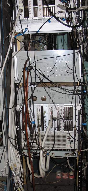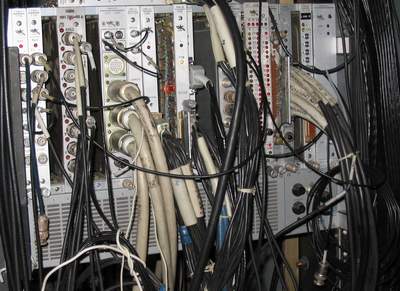 Для сравнения новой системы питания с классической для института вполне уместно привести фотографии систем, базирующихся на стандарте КАМАК. Первая фотография показывает остатки старой системы питания ЛСЭ. Здесь можно увидеть сколько кабелей с аналоговыми сигналами должно быть между стойками источников питания и крейтами КАМАК.