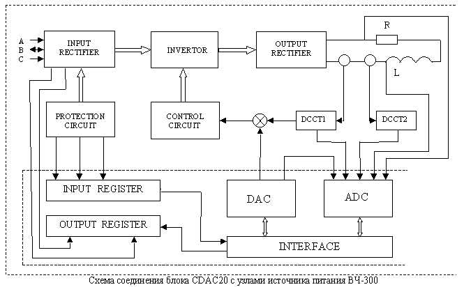 Устройство CDAC20 разрабатывалось специально для использования в составе прецизионного источника питания ВЧ-300, в соответствии со спецификациями разработчиков источника питания. В этом приложении используются все ресурсы блока. Цифроаналоговый преобразователь задает выходной ток. 5 входов аналого-цифрового преобразователя используются для измерения выходного тока и некоторых дополнительных контрольных напряжений. Выходной регистр используется для управления дискретными сигналами- сброс триггеров защиты, включение/отключение силовых цепей. Входной регистр используется для передачи в ЭВМ состояний цепей защиты и блокировок.
