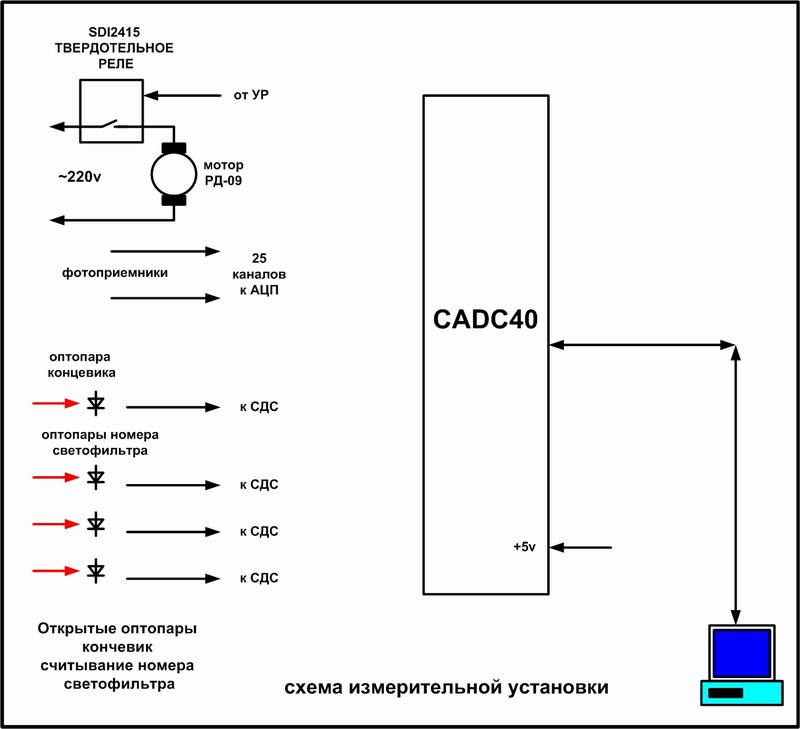 Как видно из схемы вся автоматизация эксперимента обошлась использованием единственного стандартного устройства- CANADC40. Это одно из первых приложений, где были использованы все функциональные "излишества" блока. Единственное устройство управляет электродвигателем посредством выходного регистра, контролирует положение диска со светофильтрами и номер включенного светофильтра посредством входного регистра и многоканальный АЦП блока обмеряет линейку фотоприемников. И еще один примечательный момент должен быть отмечен- пользователей удовлетворило стандартное встроенное программное обеспечение блока. Это свидетельствует как о достаточной функциональности устройства, так и о высокой квалификации пользователей.