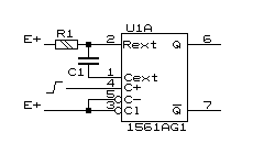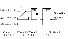 ![]() ![]() Сдвоенный одновибратор имеет вход запуска по положительному (C+) и по отрицательному (C-) перепаду. Неиспользуемый C+ должен быть подключен к Gnd, а неиспользуемый C- к Е+. Вход Clear обеспечивает прекращение выходного импульса. Неиспользуемый Clear должен быть подключен к Е+. Однако, если не используется вся секция, ее Clear должен быть подключен к Gnd. В перезапускаемом режиме очередной импульс запуска продляет незавершенный выходной импульс. В неперезапускаемом режиме требуется соединить -Q и C- при использовании C+, или Q и C+ при использовании C-. При C>10000 пф ширину импульса можно определить по формуле T=0.5*R*C; R в КОм, C в пФ, T в нс. Минимальное значение внешнего резистора 5 КОм. Максимальное значение внешней емкости 100 мкФ. При R=100 КОм, C=1000 пФ в диапазоне температур -55 +125 длительность импульса изменяется на 2.5% (типовое). При R=5 КОм, C=1000 пФ при изменении напряжения питания на 5% длительность импульса изменяется на 1.0% (типовое). |