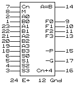 | A0-A3, B0-B3 - входы операндов; F0-F3 - выход результата; S0-S3 - код функции; M- выбор операции арифметические/логические; Cn- вход переноса; Cn+4- выход переноса; A=B- выход компаратора; -P,-G - выходы для стыковки со схемой ускоренного переноса. |
