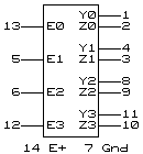 4 независимых двунаправленных аналоговых ключа. Потенциал H на входе Ei включает
