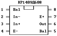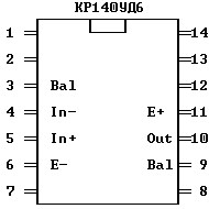 | Резистор баланса (1-10 КОм) включается между выводами 3 и 9; его средняя точка- к выводу 6 (E-). |