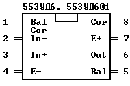 Резистор баланса включается между выводами 1 и 5; его средняя точка- к выводу 4 (E-). Емкость коррекции (30 пФ) включается между выводами 1 и 8. Микросхема 153УД6 имеет идентичную цоколевку, но круглый металлостеклянный корпус. |